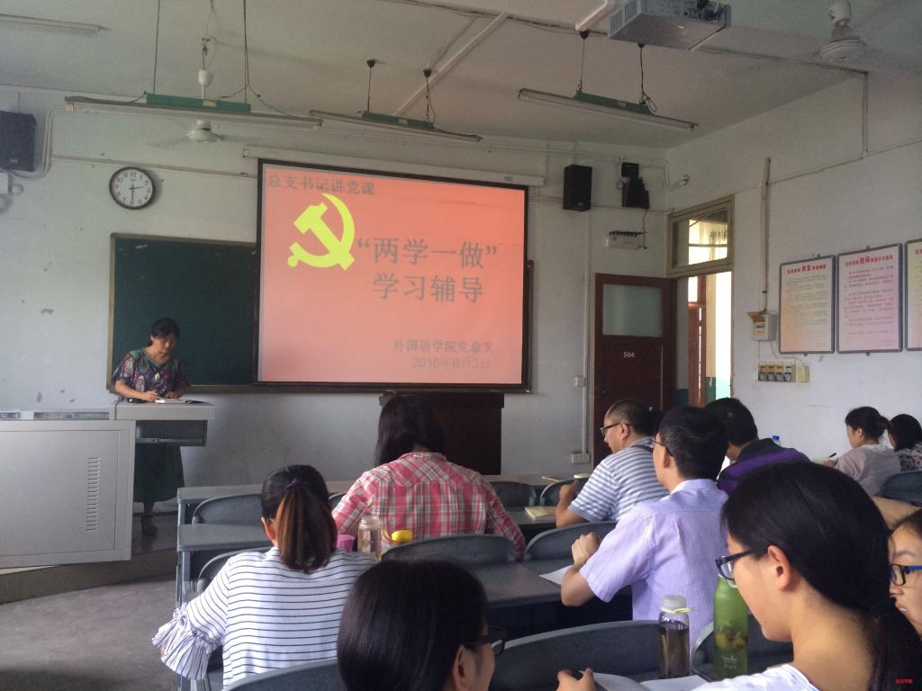 根据中共四川省委组织部关于在“两学一做”学习教育中进一步抓好学习的通知,为深入学习习近平系列重要讲话精神,提高党员的党性修养和思想认识水平,外国语学院党总支书记罗春雁于2016年6月3日下午14:30,在第二教学楼502教室为外国语学院教职工党支部和外国语学院2013级英语、英语教育专业学生党支部上党课,开展“两学一做”学习辅导,组织学习《习近平总书记系列重要讲话读本(2016年版)》,着力推进党员队伍思想、组织、作风、纪律建设。