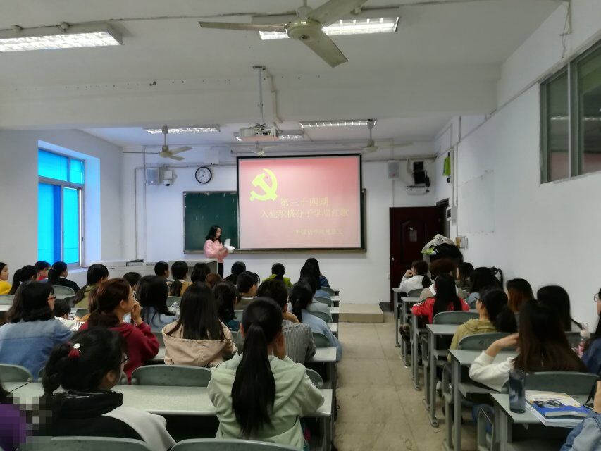 2018年4月23日中午12点40分,外国语学院第34期入党积极分子培训班学员在二教210举行了“五个一”活动之学唱红歌活动。全体入党积极分子培训班学员学习唱《国际歌》和《没有共产党没有新中国》。