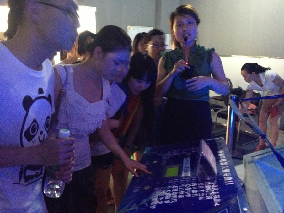 “欢迎光临宜宾科技馆!”宜宾本土的神话人物哪咤塑像一见到进入科普展厅的师生们就亲切地问候道。在这次参观活动中,同学们先后参观了科普展厅、数字科普厅、科技成果展厅、青少年科技活动室、放映厅。在参观中,由于大部分同学以前是文科生,对以前从未看见过的东西,非常好奇,一边看、一边动手去感受,向解说员、老师询问,希望多了解一些知识,杜老师和解说员也给同学们耐心的讲解。