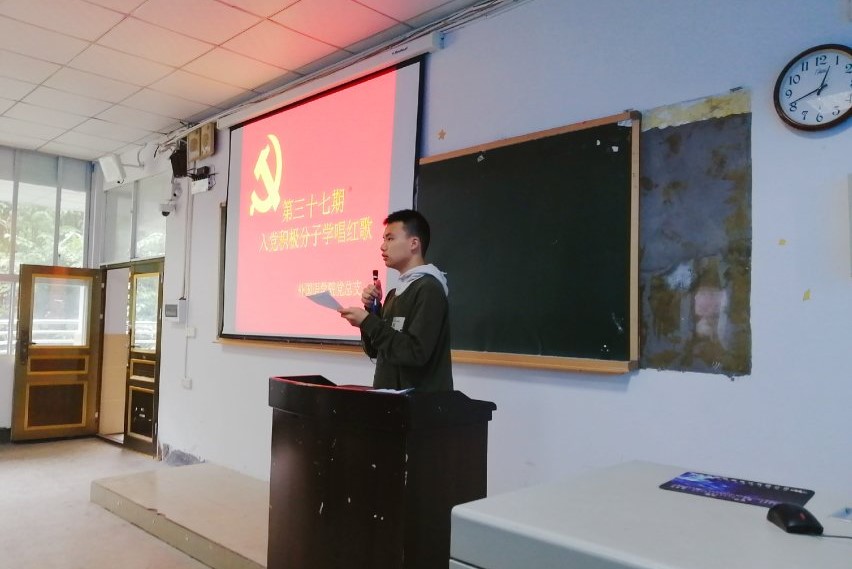 2019年10月9日中午12点40分,外国语学院第三十七期入党积极分子学员学唱红歌活动在学校A区铭志楼502教室举行。本次学唱红歌活动主要由李美龙和魏江容两位同学主持。