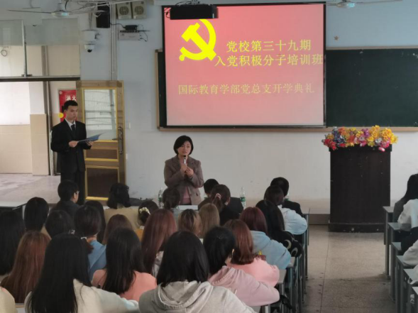 2020年11月6日中午12点50分,党校第三十九期入党积极分子培训班国际教育学部党总支开学典礼在铭志楼502举行。国际教育学部党总支书记罗春雁、正处级组织员袁成钢、党总支副书记林顺虎、党总支委员杜云以及学生党支部书记何丹丽、王科元出席了开学典礼。本次开学典礼由国际教育学部学生党务办公室发展部副部长彭放主持。