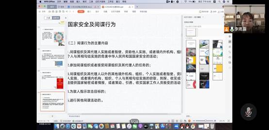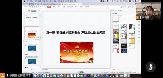“覆巢之下岂有完卵”,为使同学们充分意识到国家安危与个人命运的关联,激发同学们的爱国热情,帮助其坚定理想信念,自觉执行保密规定。国际教育学部于2021年11月28日利用主题班会的时间在线上开展了以“积极维护国家安全,保守国家秘密”主题班会。学部2021级-2019级全体学生参加了本次安全教育主题班会