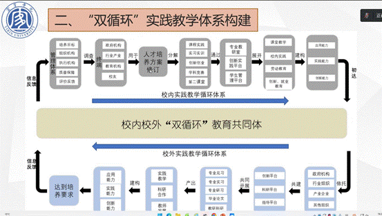 在学习党的二十大报告基础之上,赵亚玲展示了国际教育学部校内校外“双循环”实践教学体系的探索与实践。为贯彻落实教育部有关“实践育人”文件要求、体现地方应用型高校实践教学理念、满足专业培养目标需求,国际教育学部开始构建校内校外双循环实践教学体系,形成校内校外“双循环”教育共同体,英语专业课程实践与校内外实训项目协同递进,提高人才培养质量。具体举措包括:构建“USG三位一体”协同育人机制、签订“市-区-乡镇”多层次多维度的教育实践基地、选派学部教师赴教学基地挂职锻炼。协同育人在人才共育、项目共研、服务教育、扶贫顶岗支教等方面成效显著。