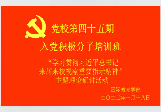 为深入学习贯彻习近平总书记来川来宜来校视察重要指示精神,进一步端正入党积极分子的入党动机,加强对入党积极分子的理想信念教育。2023年10月18日,党校第四十五期入党积极分子培训班国际教育学部学员在临港二期公共教学楼二8A102教室召开了以“学习贯彻习近平总书记来川、来校视察重要指示精神”为主题的理论研讨课,国际教育学部第二学生党支部书记何丹丽、第一学生党支部组织委员卢可指导本次理论研讨。本次理论研讨由国际教育学部团总支培训部干事王景智主持。