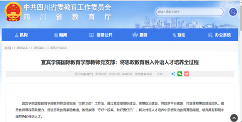 推进“三抓三促”工作法,强化了党建对外语人才思想政治教育的引领,真正把党组织的领导力和组织力转化为推进人才培养中心工作的强大动力。2021年,党支部“举党建之大旗 育民族之桃李”工作案例获评为宜宾学院“建党100周年”党支部工作创新案例。2022年,四川省教育厅官网以“将思政教育融入外语人才培养全过程”对此作了全方面的报道。党支部组建课程思政团队,开展“四史学习教育进教案” “《习近平谈治国理政》进课堂”等系列活动组织化推进课程思政工作,立项课程思政项目10余项。