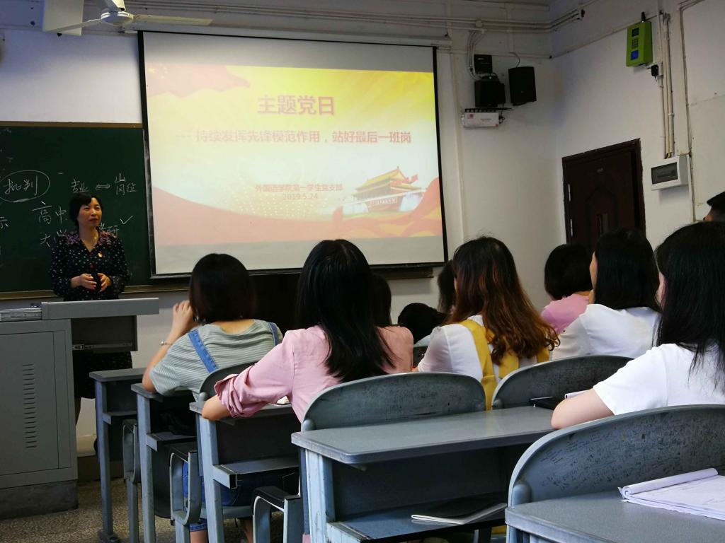 2019年5月24日,王玲院长参加了外国语学院第一学生党支部的主题党日活动。为强化毕业生党员的身份意识和使命担当,外国语学院第一学生党支部在铭志楼314教室举行了主题为“持续发挥先锋模范作用,站好最后一班岗”的主题党日活动。