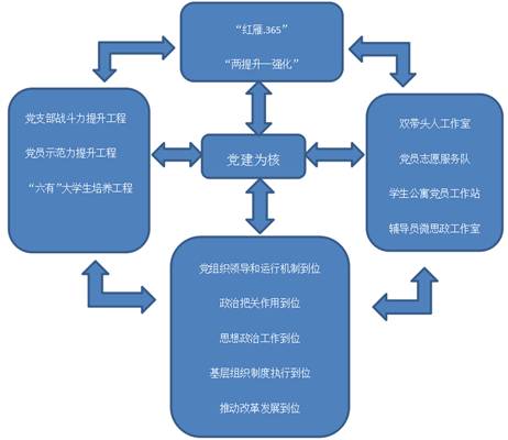 “12345”基层党建工作体系,即牢固一个核心——党建为核;开展两大行动:“红雁•365”和“两提升一强化”专项行动;推进三项工程:“党支部战斗力提升工程”,“党员示范提升工程”,““六有”大学生培养工程”;建设四项培优精品项目:教师党支部书记“双带头人”工作室、党员志愿服务队、学生公寓党员工作站和辅导员微思政工作室。坚持党建与育人树人、教育教学、科研学科、社会服务、转型发展相融合“五位一体”建设思路,确保基层党建“五个到位”。