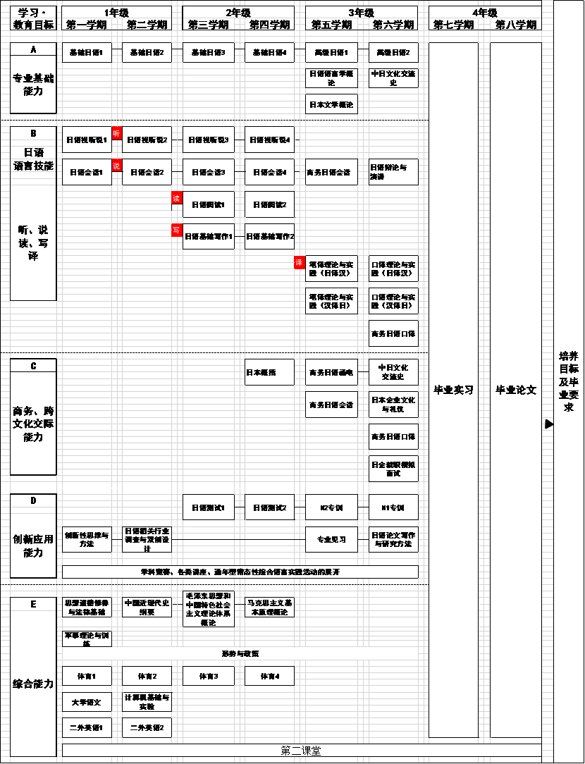 说明:1.日语专业学生须在第1学期修读校级《创新性思维与方法》课程,计2学分。 2.日语专业学生须在第2学期修读院级《日语相关行业调查与双创设计》课程,计2学分。 3.日语专业学生须在校级或院级提供的上表标记为“选修”的课程中至少选修1门,计2学分。 4.日语专业学生须在本模块课程中最低修读6学分。 |