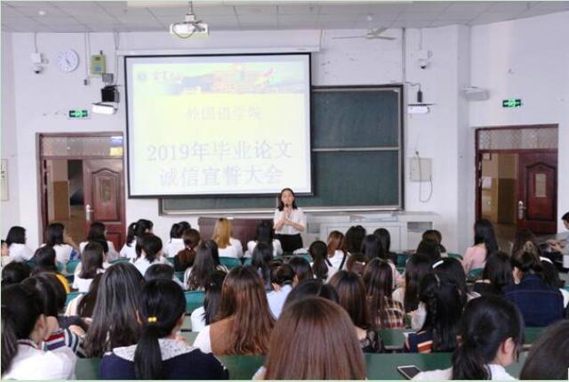 为了确保2019届毕业生诚信论文写作、诚信答辩,外国语学院于2019年5月21日下午在硕勋楼A座202教室召开了2019届毕业论文诚信宣誓会。外国语学院院长杨南翎、副院长赵亚玲和教研室主任段志高老师出席了会议,2019届毕业生参加了会议。