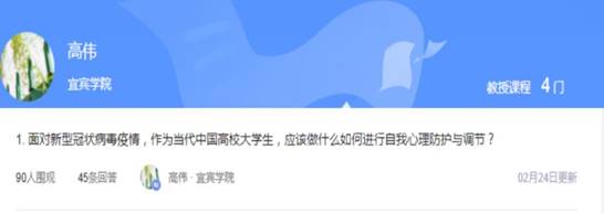 “疫”期第一课,如何发挥高校课程立德树人的关键作用,如何引导大学生传承和弘扬爱国主义精神,增强中国特色社会主义道路自信、理论自信、制度自信、文化自信,新学期第一课,我将课程内容主要放在了立德教育。首先,按照国际教育学部按照学校统一要求和部署,引领学生学习国家卫健委《新型冠状病毒肺炎健康教育手册》及《新型冠状病毒肺炎全民心理健康实用手册》,并引导学生在在线教学平台展开展积极讨论。