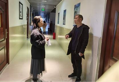 学部副部长赵亚玲与张成老师交流语言实验室设备准备情况