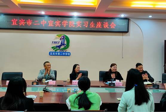 宜宾市二中副校长龙进学对赵亚玲部长一行表示热烈欢迎,重点介绍了我校实习学生的实习进展情况。座谈会上,赵部长询问了学生教学实习与班主任工作实习情况,与学生亲切交流心得体会。国际教育学部、理学部和体育与大健康学院的实习生代表分享了各自在二中实习期间的心得感悟。理学部的杨川同学分享到,在班级管理实习过程中才真正体会到教师职业的艰辛、大学期间的教学实训课与真实中学课堂存在着差异、实际教学过程中存在教材重难点把握不准及课堂管理能力欠缺等。