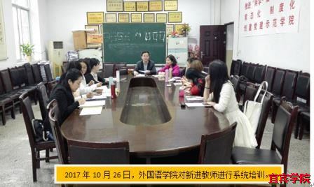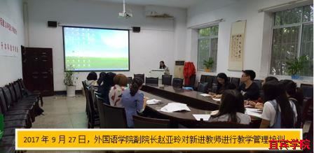 2017年10月26日,外国语学院再次组织新进教师进行教学培训。外国语学院党总支书记罗春雁对新进教师进行了师德师风培训,特别强调了高校教师对学生“三观”引导、意识形态培训,明确高校育人的三个重要问题,“培养什么样的人”,“为什么培养人”,“怎样培养人”。罗春雁还对教师们进行了党的基本知识培训,鼓励新进教师以实际行动向党总支靠拢。