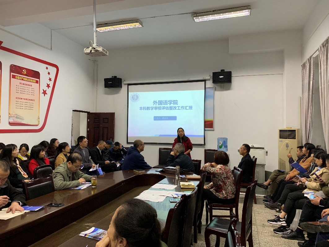 2019年11月6日下午,外国语学院本科教学审核评估整改工作学院内汇报大会在外国语学院召开。外国语学院院长杨南翎带领全体教师认真研读了本科教学审核评估整改学习手册,党总支书记罗春雁强调了持续整改的重要性,赵亚玲副院长就外国语学院本科教学审核评估整改工作,向全体教师作汇报。