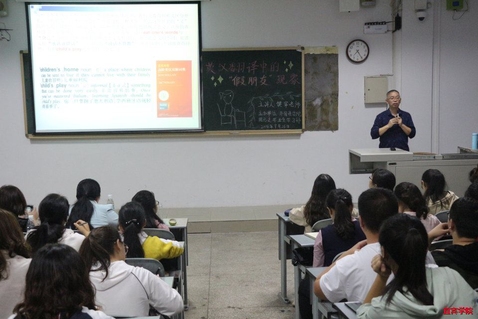 (本报讯)作为外国语学院的学生,英语翻译是一项必备的技能,然而对于不少学生来说,英语翻译非常难且容易出错。遇到英汉互译中的“假朋友”( Flase Friends)时,容易掉入它的陷阱。为了让同学们了解有关中文译文与真正英语意义的区别,外国语学院樊军老师于2018年9月26日晚上七点在第二教学楼502教室举行了“英汉翻译中的“假朋友”现象”讲座。此次讲座面向外国语学院全体学生,我院曾芸老师、徐慢老师、段志高老师出席了本次讲座。