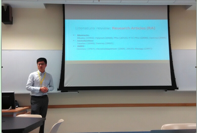 他首先报告选题缘起:目前学术话语/语篇研究领域缺乏学术口语方面的研究,而由澳大利亚昆士兰大学2008年发起,目前世界各大高校纷纷举办的 “3分钟论文”(3MT) 比赛更是研究空白,接下来阐述了该研究的必要性和重要性,他还介绍了该研究的理论框架为语步分析(move analysis)和元话语(metadiscourse),研究目的为探讨学科背景对3MT报告的影响。刘老师还分享数据收集及标注情况,并重点讨论了他提出的 “三分钟论文”报告的初步的语步分析框架,最后还报告了论文的下一步工作计划和选题意义并回答了三位现场观众的提问。