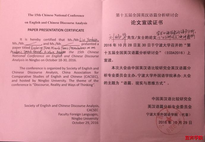 10月28-30日,全国“第15届英汉语篇分析研讨会”在宁波大学举行。本次会议由中国英汉语比较研究会英汉语篇分析专业委员会主办,宁波大学外国语学院承办,共有来自全国(包括香港,台湾)的近百所高校的百余名代表参加了此次研讨会。我校外国语学院教师刘焰华作为四川省高校的唯一代表出席了本次会议,并做了题为《学术口语体裁的语步分析:以“三分钟论文”演讲为例》的分组发言。