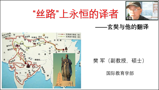 2023年3月18日上午,国际教育学部副教授樊军在线举办了一场名为“‘丝路’上永恒的译者——玄奘和他的翻译”的学术讲座,国际教育学部90余名师生在线聆听了讲座。
