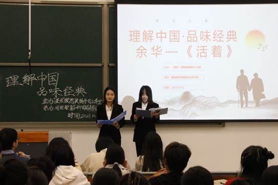 “飒飒秋风今又是,万木霜天红烂漫。”同学们一起品读并探讨余华的经典著作《活着》,共同浸润于书扉墨香之中,感受并体会主人公福贵苍凉寂寞、坎坷艰难却又坚韧不屈的一生。余华的《活着》是人生不可不读的一部经典,“它告诉你人是为活着本身而活着,而不是为了活着之外的任何事物所活着。”此次活动以观众与分享者之间互动的形式一起走进知识的世界,不断丰富对人生的理解,启迪同学们追求崇高的理想。