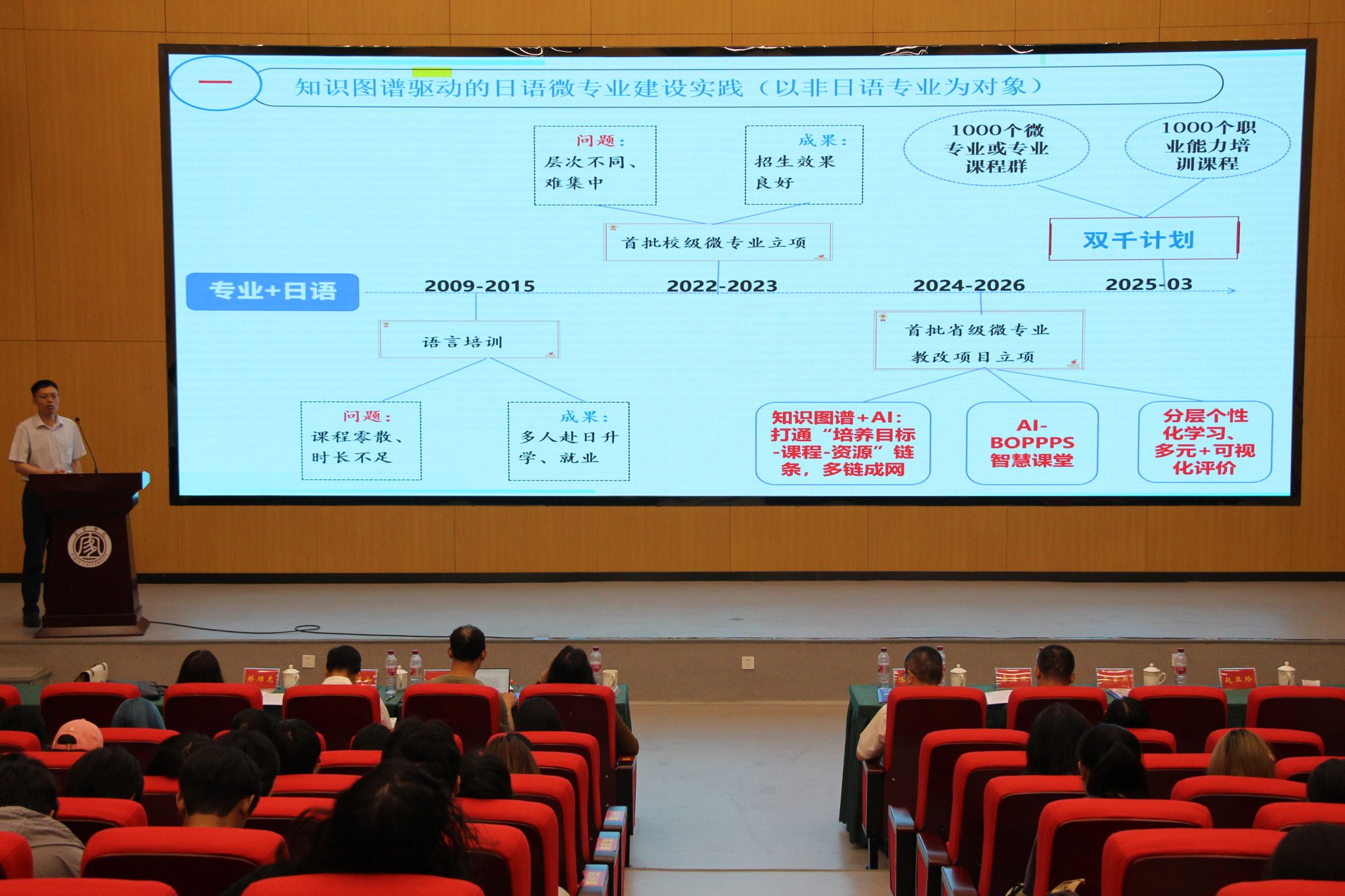 吴宦熙作了题为《知识图谱赋能微专业实践与“日语 + X”复合型人才培养路径探索》的专题报告。他针对地方高校非日语专业学生在涉日业务场景中存在的“专业能力过硬但日语应用不足”的能力断层,以及日语专业传统“语言技能型”培养模式导致的毕业生对口就业难这一双向困境,提出了构建由“六维模型 + 四维微课程群”组成的专业知识图谱驱动型 AI-BOPPPS 智慧教学模式,探索“日语 + X”复合型人才培养新范式,为破解日语人才培养中的现实问题提供了创新性思路与方法论支撑。