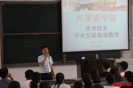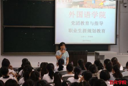 (本报讯)为了让17级新生对大学生活有进一步的了解,2017年九月十日上午宜宾学院外国语学院党总支书记罗春雁在第一教学楼202为新生主持讲解了以党团教育与指导为主题的课程,并邀请了李晓霞和周圣川两位外国语优秀毕业生对新生进行职业生涯规划与教育。