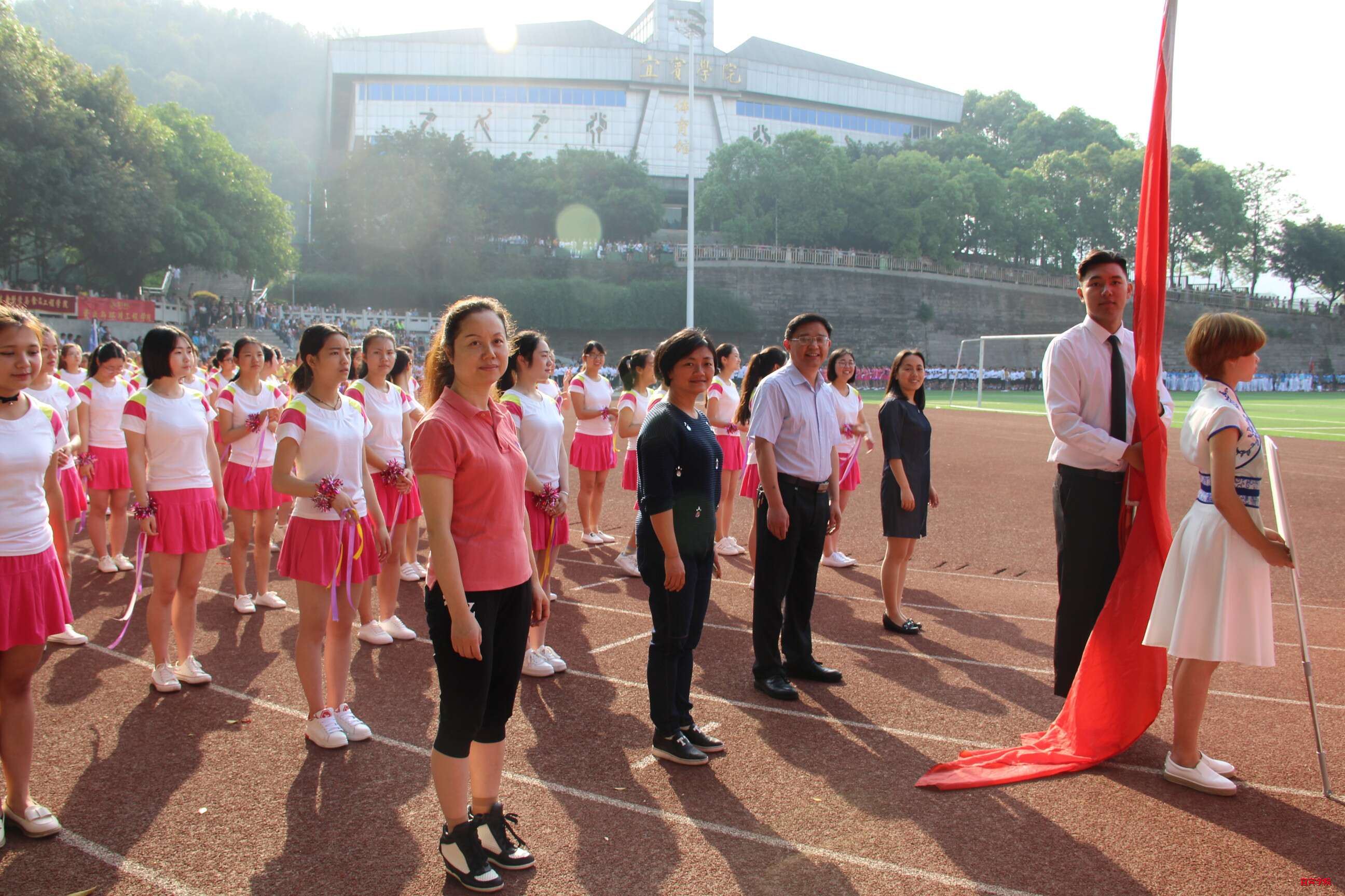 外国语学院代表方队在我院杨南翎院长等领导的带领下,踏着整齐的步伐,伴着嘹亮的口号阔步向前。他们身着白色T恤、粉色短裙;手系彩带,朝气蓬勃。每一名队员都面带自信的微笑,展现出她们巾帼不让须眉的霸气。青春是诗,青春是歌。外国语学院代表队是一支团结进取,富有执着信念的团队;是一个敢于追梦,富有青春活力的团队。Stay young,Forever young. 外国语学院的运动健儿们,你们最棒!