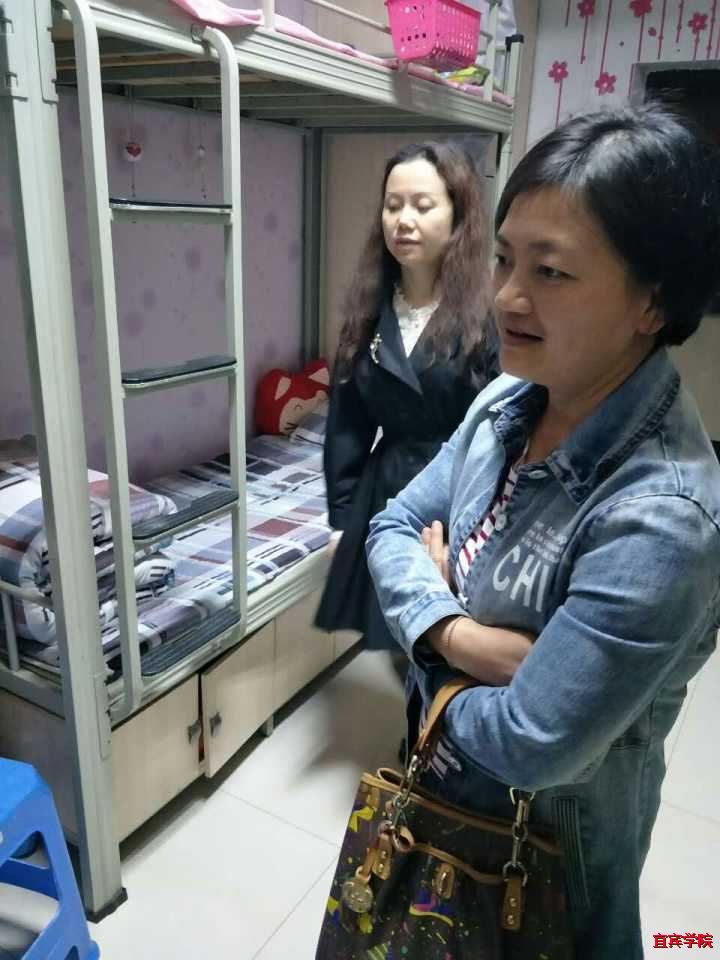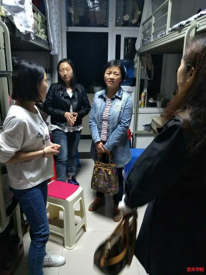 (本报讯)繁华四月,夜风袭袭。为进一步了解同学们的宿舍生活情况,提高住宿生的安全意识,2017年4月6日晚,宜宾学院外国语学院党总支书记罗春燕老师、党总支副书记温萍老师、团总支副书记袁超老师及2015级辅导员王星老师对住在三舍、四舍和十二舍的外国语学院学生学生宿舍进行了例行突击检查。