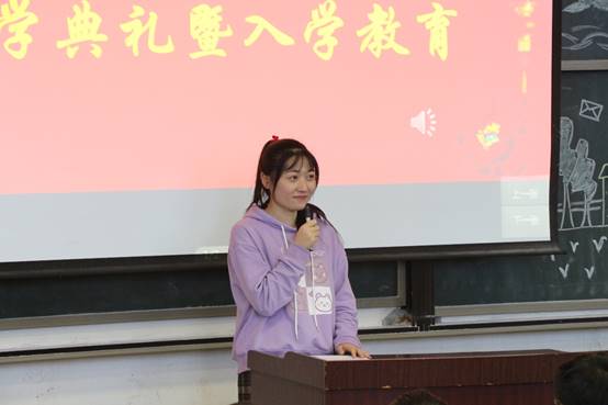 2018级学生代表王星说:“大学生活,应该是梦想开始的地方”,鼓励2020级萌新们要充分利用大学平台,学好专业知识,积极参加第二课堂,全面提升自己,为成为高素质综合型人才增添助力。新生代表王贺同学的发言。他代表2020级新生表达了对大学生活的美好憧憬,倡议全体新同学秉承求实,求是,开放,创新的校训精神,脚踏实地、努力学习、勇担使命,四年后交出党和人民满意,家长满意、自己也满意的答卷。