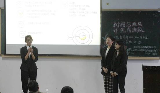 展示后,国际教育学部党总支副书记林顺虎对评选活动进行了点评。他指出各班准备充分,各班在学习成绩、创新创业、学科竞赛等方面取得了较好的成绩,希望各班以此次评比为契机,以班徽、班训、班风为指导,对班级进行“再建设”,预祝各班在一年之后更加优秀!
