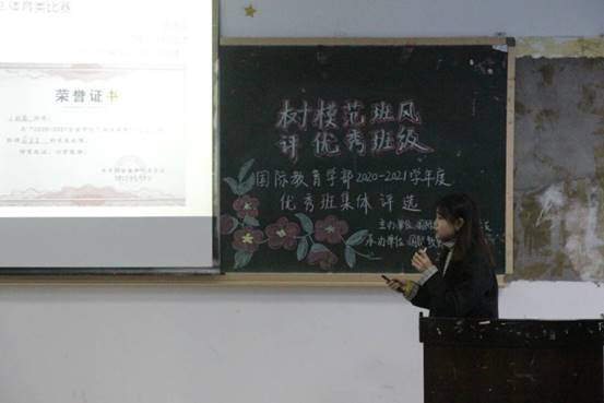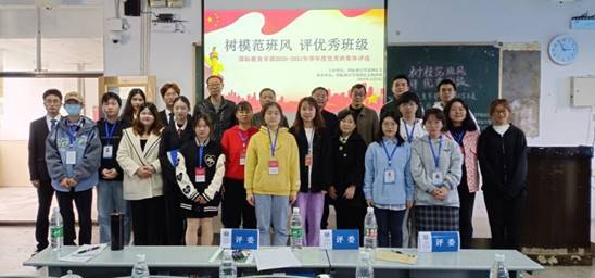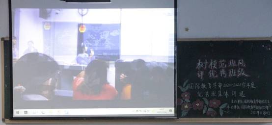 2021年11月4日下午,国际教育学部在铭志楼502教室举行2020-2021学年度“树模范班风 评优秀班级” 校级优秀班集体评比答辩会。学部党总支书记罗春雁罗书记,部长杨南翎杨部长及学部其他几位领导、老师和学生代表参加了评优答辩会,评委认真、客观公正地为比赛评分。
