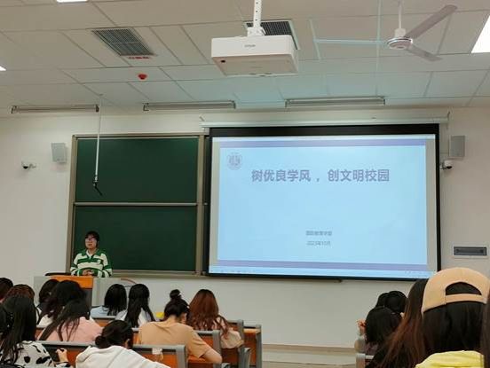 为了积极响应学校“三风”建设的号召,提高广大学生对“三风”建设必要性和重要性的认识,国际教育学部组织学生于2023年10月6日展开“树优良学风,创文明校园”主题班会,本次班会由辅导员何丹丽老师主持。