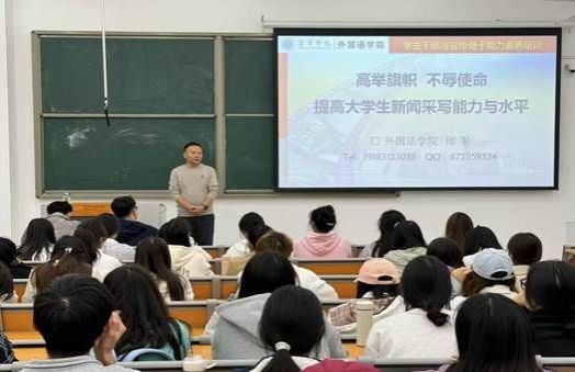 为提高大学生新闻消息和工作简报写作能力与水平,进一步加强校园新闻宣传工作,2024年11月7日,外国语学院在临港校区二期8D104教室开展学生干部与宣传骨干能力素养培训会。本次培训会由外国语学院副处级组织员邱军主讲,学院团总支、学生会、党务办等部门学生干部和新闻宣传工作骨干50多人参加培训。