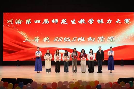 晚会特别设置颁奖环节,通过两轮表彰集中展示学院育人成果。第一轮为学科专业竞赛颁奖,表彰在2025“外研社·国才杯”“理解当代中国”四川省大学生外语能力大赛、四川省“高教社杯”大学生“用外语讲好中国故事”优秀短视频大赛、全国国际中文教育教学技能大赛、巴蜀“菁英杯”笔译大赛、川渝师范生教学能力大赛等赛事中荣获佳绩的学子,充分体现学院在语言能力、跨文化交际与教学实践方面的培养成效。第二轮为创新创业与综合素养颁奖,表彰在“建行杯”四川省国际大学生创新大赛、全国大学生电子商务“创新、创意及创业”挑战赛中获奖的团队,以及外国语学院2024-2025学年度“十佳之星”获得者。这些荣誉不仅是对学生专业能力与创新精神的肯定,更是学院推动“三全育人”、落实“五育并举”的生动写照,为全体同学树立了学习榜样,营造了见贤思齐、奋发向上的成长氛围。
