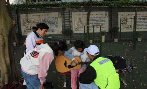 首先,活动组织人员召集干事及志愿者在校门口集合,并集体乘坐公交车到达宜宾市特殊教育学校。到达目的地后,志愿者们以小组的形式,分别教小朋友们弹吉他、唱歌和剪纸等各类活动,并和他们打篮球,下象棋,打乒乓球……整个操场充满了欢声笑语。此外,小朋友们也热情主动地向志愿者们提出问题,与他们交流讨论相关技能;志愿者们也积极发挥他们的才艺,为小朋友们表演节目。最后,青年志愿者大队和小朋友们一起拍照留念,为此次活动画上了圆满的句号。