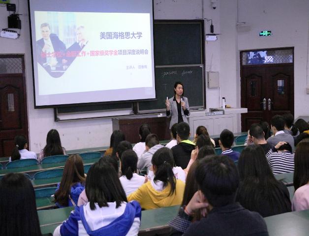 为促进我院海外交流发展,拓宽我院学生出国的渠道,提高我院学生对深层次学习的积极性,2019年4月14日下午五点,外国语学院在硕勋楼A座202教室举办了美国海格思大学项目宣讲会。美国海格思大学项目招生处老师谭春梅就美国海格思大学留学项目的相关事宜为外国语学院的2018级、2017级以及2016级的学生作了详细的介绍。