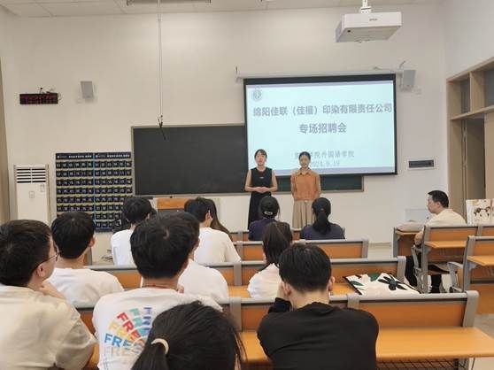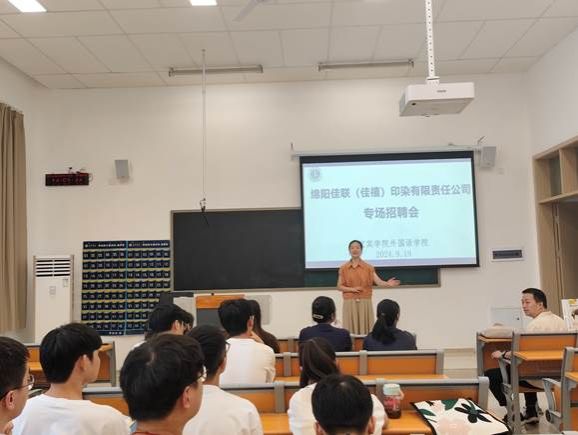 为贯彻落实党的二十大精神和习近平总书记来川来宜来校视察重要指示精神,宜宾学院外国语学院采取“走出去”、“请进来”等多种方式积极开展访企拓岗促就业专项行动。2024年9月19日下午,外国语学院在临港校区二期8号楼8A104教室举办了绵阳佳联(佳禧)印染有限责任公司专场招聘会。该单位招聘外贸人员6名,生产技术人员8名,以及生产管培生6名。外国语学院党委副书记李丽娟、就业专干李雨露以及部分2025届毕业生参会。