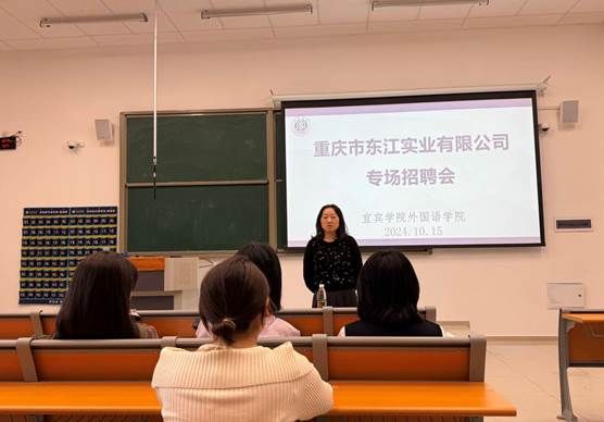 为深入贯彻落实党的二十大精神和习近平总书记来川来宜来校考察重要指示精神,宜宾学院外国语学院采取“走出去”,“请进来”等多种方式积极开展访企拓岗促就业专项行动。2024年10月15日下午,宜宾学院外国语学院在临港校区二期八号楼8A105教室举办了重庆市东江实业有限公司专场招聘会。外国语学院党委副书记李丽娟、就业专干李雨露以及部分2025届毕业生参会。