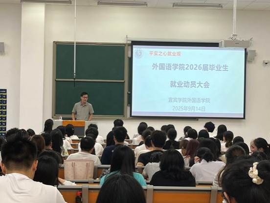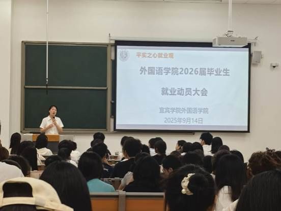 为帮助学生明确实习目标,做好实习准备,增强就业意识和安全意识,2025年9月14日,宜宾学院外国语学院在临港校区二期8E104召开了2026届毕业生实习、就业动员会,外国语学院党委书记林顺虎、党委副书记李丽娟、毕业班辅导员以及全体2026届毕业生参会。