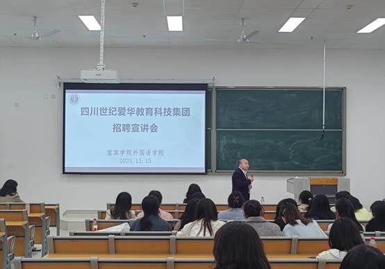 为深入贯彻落实习近平总书记来宜来校视察关于毕业生就业工作的重要指示精神,优化就业指导服务,积极开展访企拓岗促就业的专项活动,助力毕业生成功就业。2024年11月15日下午,宜宾学院外国语学院在临港校区二期6号楼101教室举办了四川世纪爱华教育科技集团招聘宣讲会。爱华教育带来了若干个教师岗位,涵盖英语、数学、物理、化学等多个专业,包括小学、中学两个阶段,吸引各学部多名同学参加。外国语学院院长赵亚玲、党委副书记(主持工作)林顺虎、党委副书记李丽娟、就业专干李雨露以及部分2025届毕业生参会。