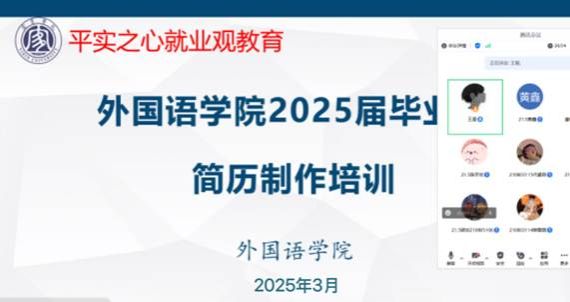为深入贯彻落实习近平总书记来校视察重要讲话精神,做实做细就业指导服务,帮助2025届毕业生实现更充分、更高质量就业,2025年3月20日,外国语学院线上开展了就业指导培训课《高校毕业生简历制作及面试技巧》,该课程由王星主讲,毕业班辅导员及2025届全体毕业生参与了此次培训。