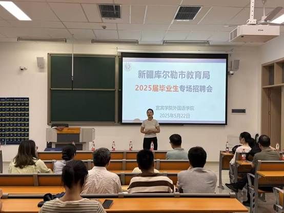 为扎实推进毕业生就业工作,宜宾学院外国语学院采取“走出去”、“请进来”等多种方式积极开展访企拓岗促就业专项行动,助力2025届毕业生高质量就业。2025年5月22日上午,外国语学院在临港校区二期8A101教室举办了新疆库尔勒市教育局2025届毕业生专场招聘会。该单位带来了若干个高中教师岗位,涵盖英语、语文、数学等专业,各专业2025届毕业生积极参会。