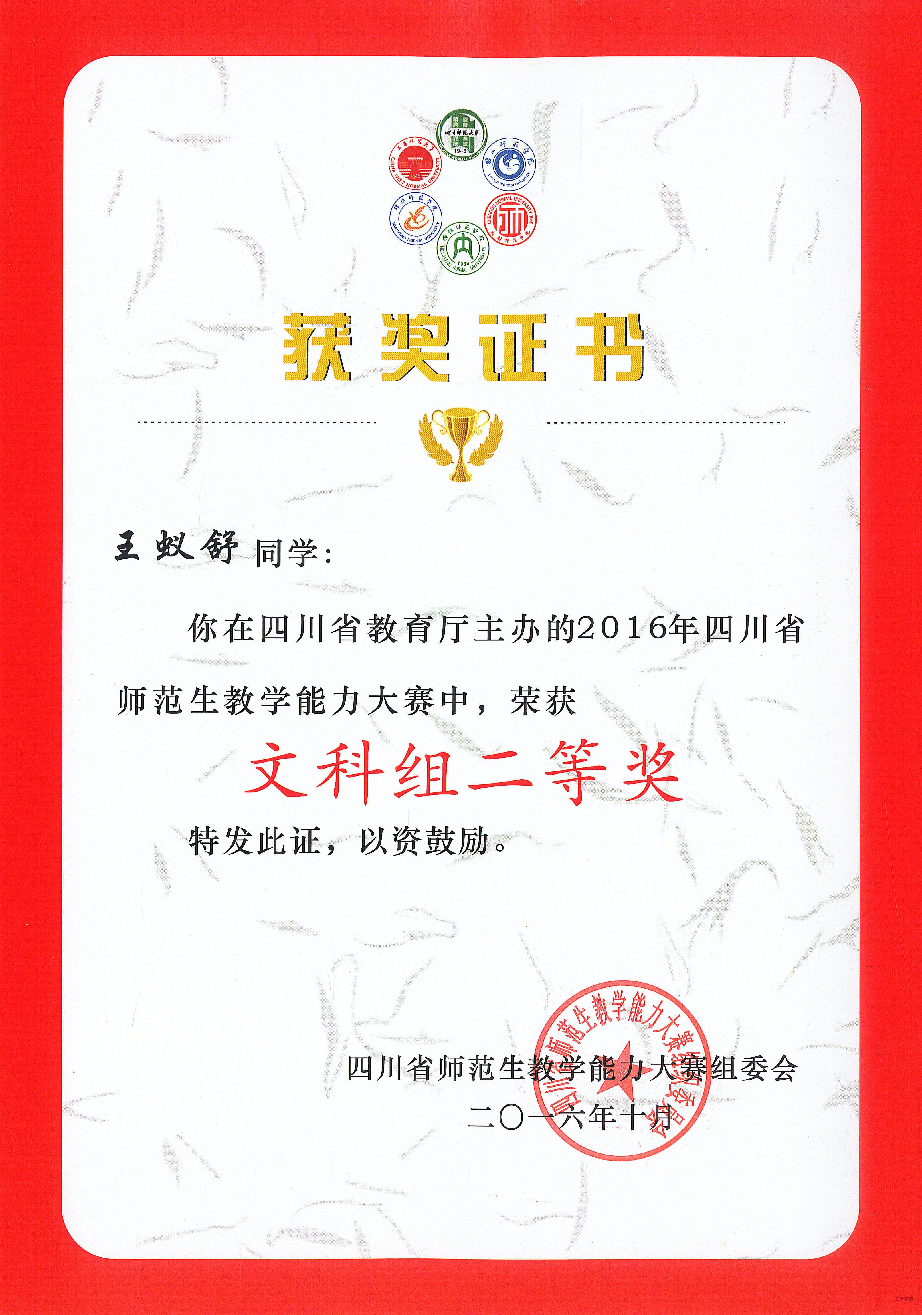 2016年10月28日-30日,一年一度的由四川省教育厅主办、四川师范大学承办的2016年四川省师范生教学能力大赛在四川师范大学狮子山校区隆重举行,本次比赛共有来自于四川师范大学、西华师范大学、宜宾学院等15所高校的157名师范生代表参加,比赛分为文科1组、文科2组、理科1组、理科2组和艺体组5个组别,包括汉语言文学、数学与应用数学、心理学、学期教育、音乐学等20余个学科和专业,内容设置为说课、模拟授课、现场答辩三个环节,评分标准覆盖教学设计、说课、讲课、板书设计与书写、课件制作、现场答辩等方面。