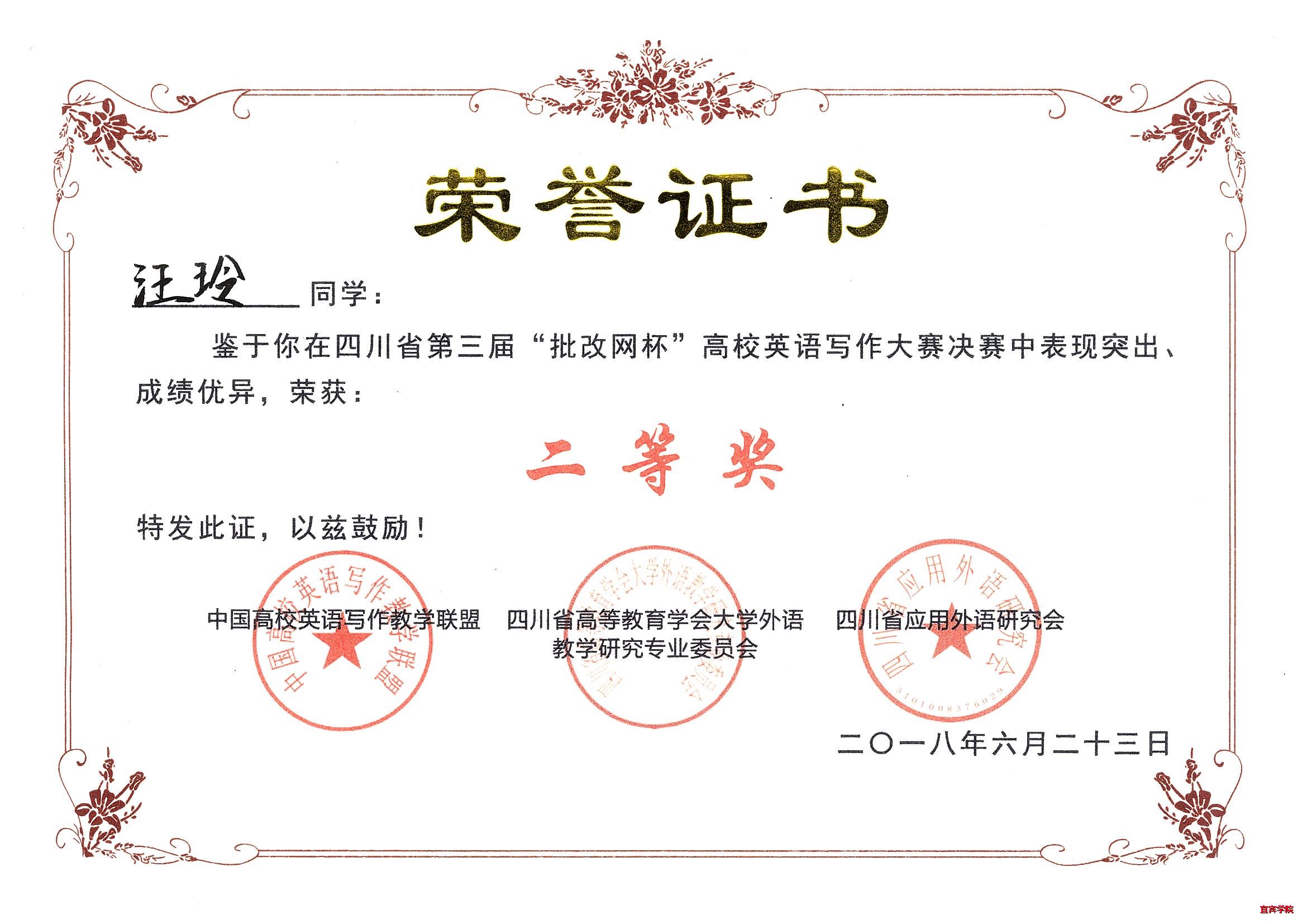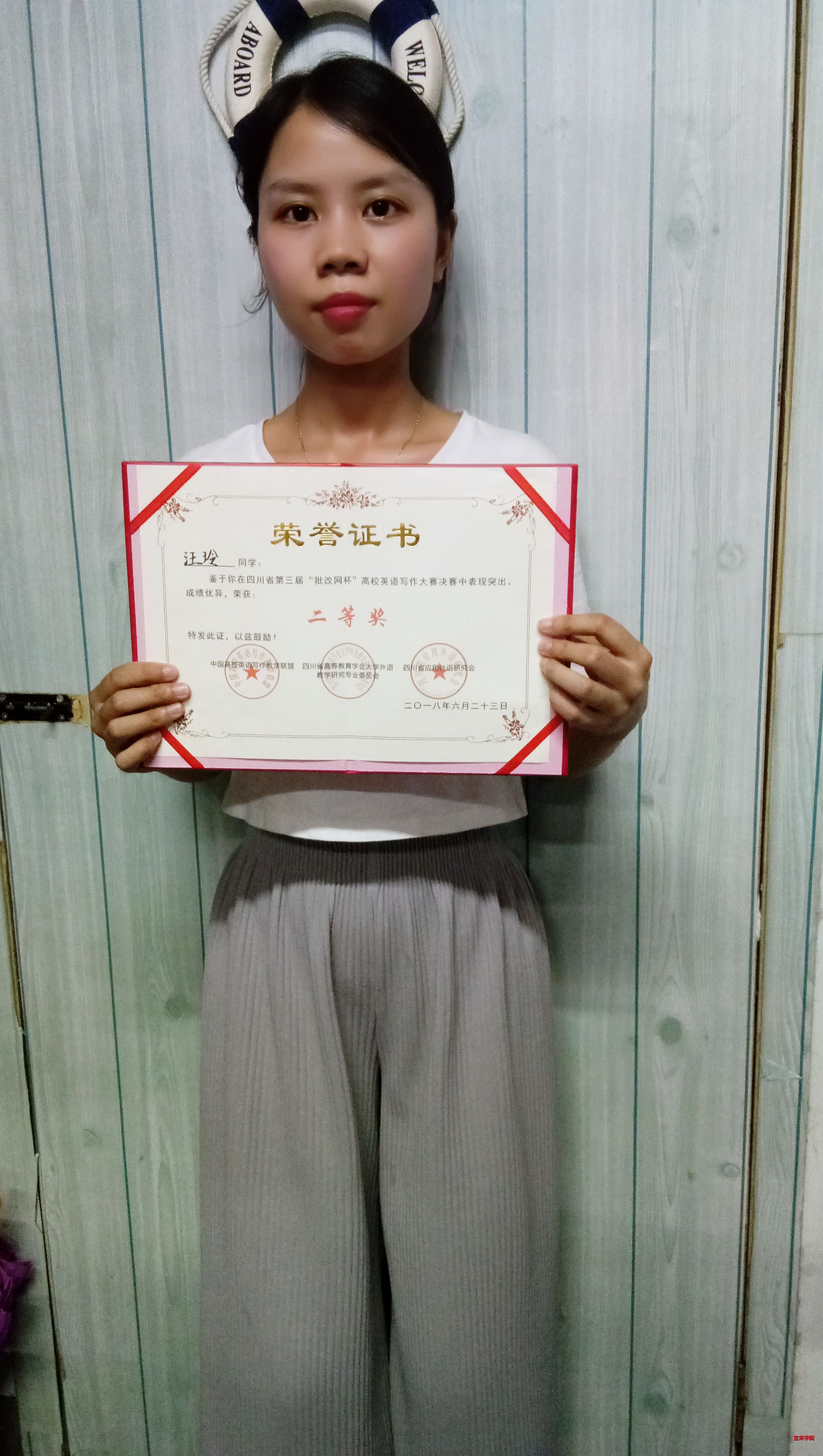 此次写作大赛分为初赛与决赛,经过如火如荼的初赛,我校推荐一名学生参加决赛,最终我校外国语学院2016级1班汪玲在紧张的与120余名决赛选手的角逐中荣获二等奖,外国语学院唐霞老师获优秀指导教师奖。