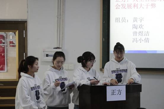 本次活动共有十队选手参与,比赛开始之前,十队选手随机抽取本次辩论的主题。比赛主题涉及在校大学生兼职、人工智能发展、父母与子女的代沟等社会关注的热点问题。活动正式开始,首先由主持人宣读此次辩论赛的规定并介绍莅临此次辩论赛的评委老师;接着,各组选手按顺序上场,比赛共有“陈词立论,辩驳立论,自由辩论,总结陈词”四个阶段。在辩论过程中,正方和反方辩手用英语清晰地表达自己的论点,一针见血地提出反驳观点。在特邀队伍法管学院辩论环节,比赛场上可谓唇枪舌战、精彩绝伦,引来观众们的阵阵掌声,将辩论赛推向高潮。最后,评委老师针对本次辩论赛进行总结,提出了意见。