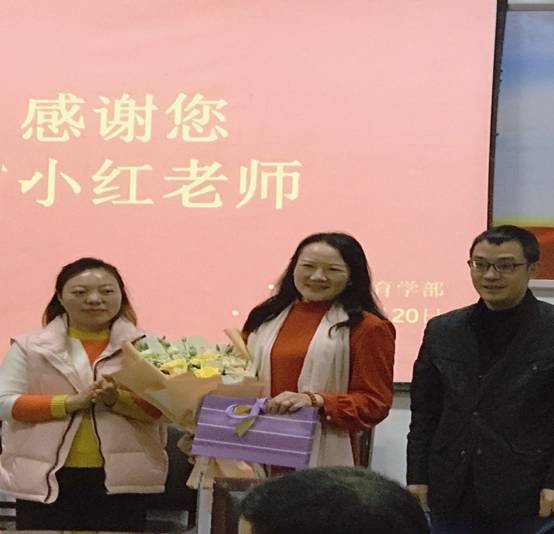 最后国际教育学部工会主席林顺虎和青年教师代表宋玉梅为张小红老师献上美丽花束和礼物,以此表达对张小红老师的尊敬、感激、不舍与祝福。张小红老师频频起身致谢,在哽咽中表达了对学部的感激和不舍,表示即使退休了也会一如既往关注学部发展,愿为学部的发展继续贡献自己的力量。