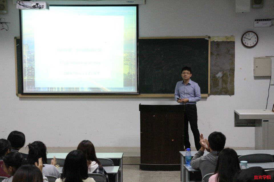 邓历冬老师以幽默风趣的提问,拉开了“就业,从热爱你的专业开始”为题的交流会帷幕。他以“对大学毕业后工作是否很迷茫?”这个问题,引起了同学们深深思考,并由此讲述了自己的学习及创业经历。在此期间,邓老师结合生活举例,与同学们互动交流,语言幽默,思路清晰,极大地带动了同学们的热情。随后邓老师提出了大学必须做的三件事,以提高日语专业学生对大学生活的认识。同时介绍了日本的知名企业和大学,让日语专业的学生了解到更多的学习和就业方面的知识。