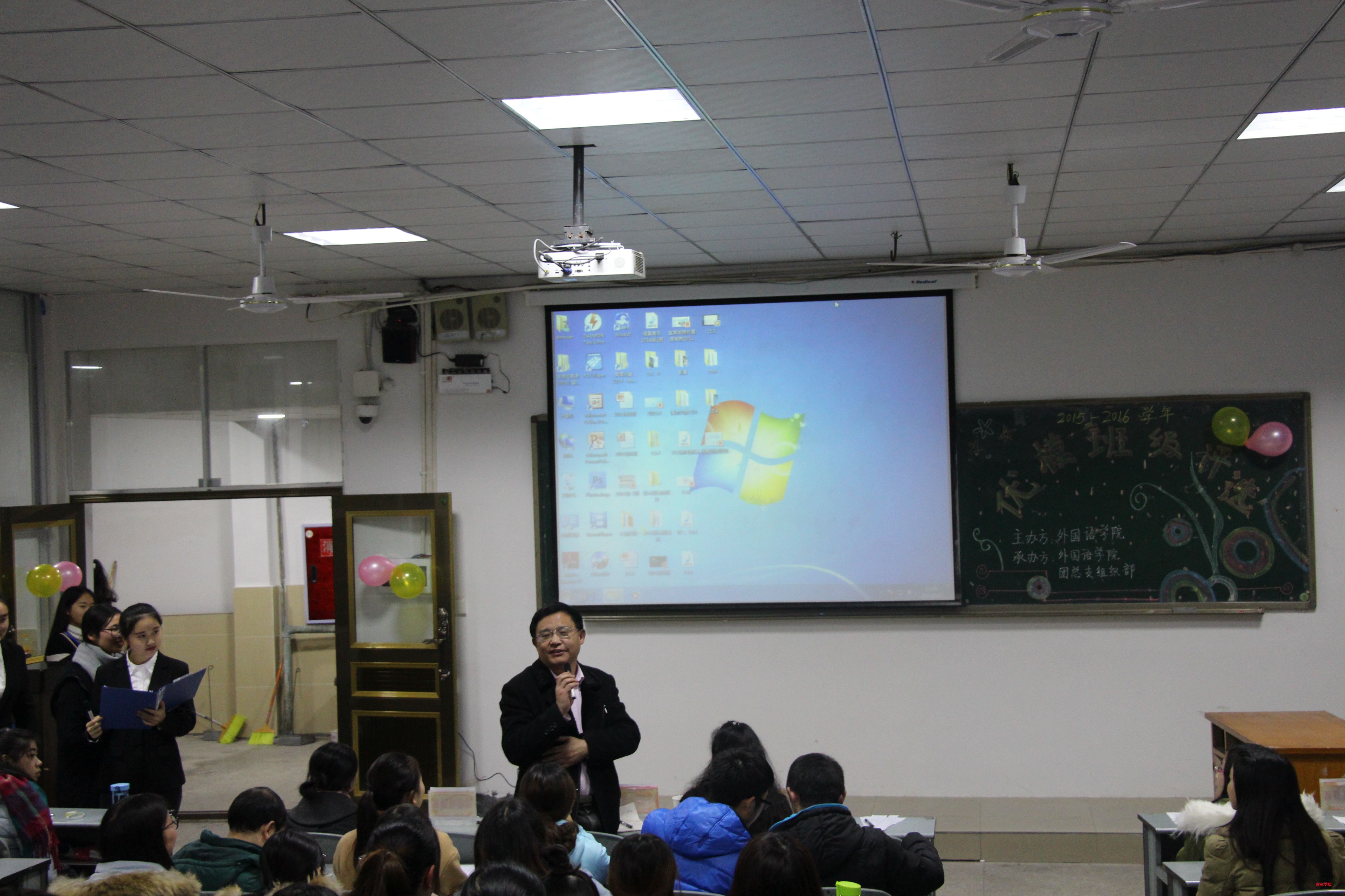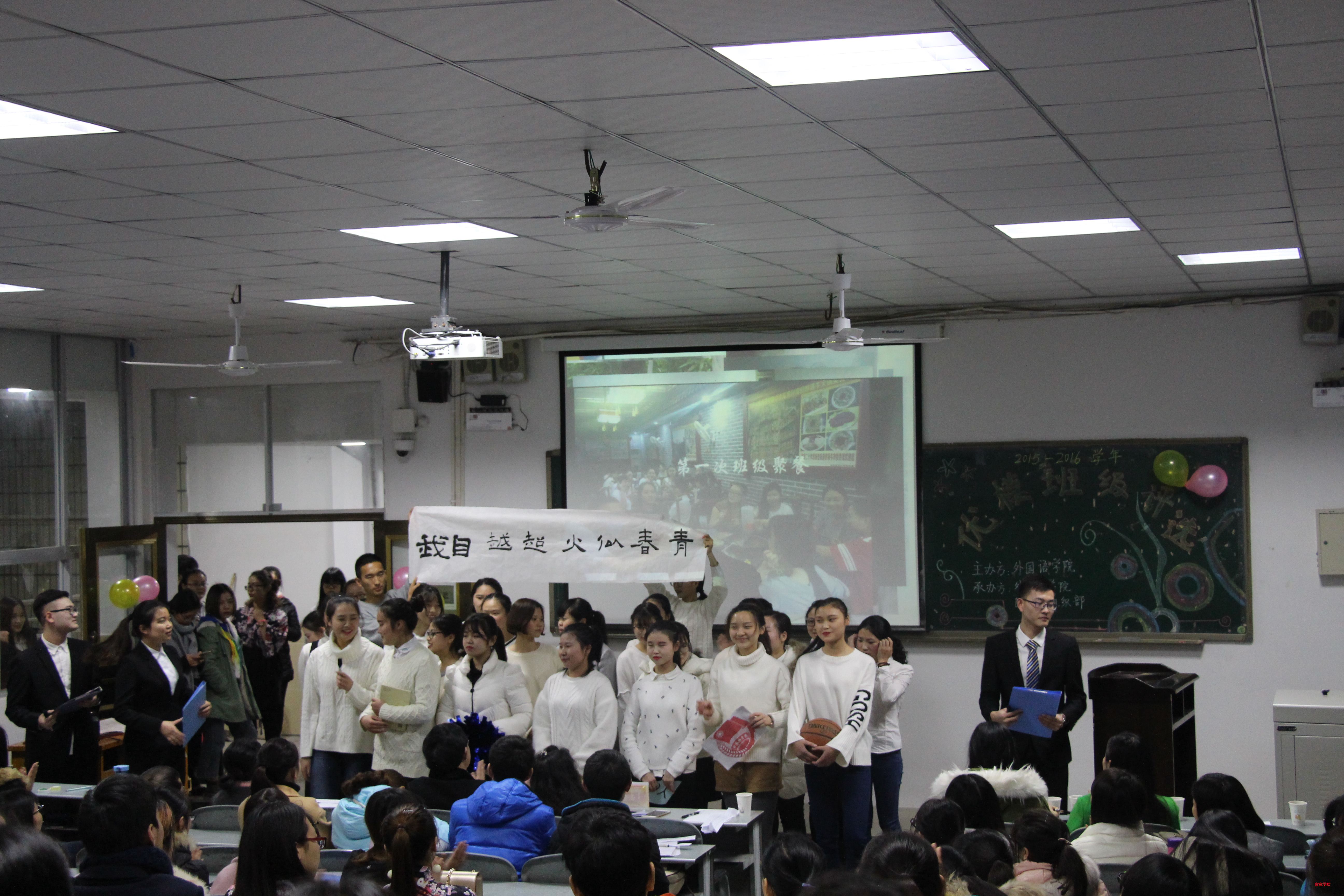 (本报讯)为促进外国语学院的学风建设,提高同学们的团体意识,增强其班级凝聚力。216年12月5日下午19时,由外国语学院主办、外国语学院团总支学生会组织部承办的外国语学院外国语学院优模班级评选在我校第二教学楼502教室隆重举行。外国语学院14级、15级共计14个班级参与了本次评选。班级代表们积极筹备,发挥奇思妙想,用丰富多彩的形式展现了各个班级独特的风采。
