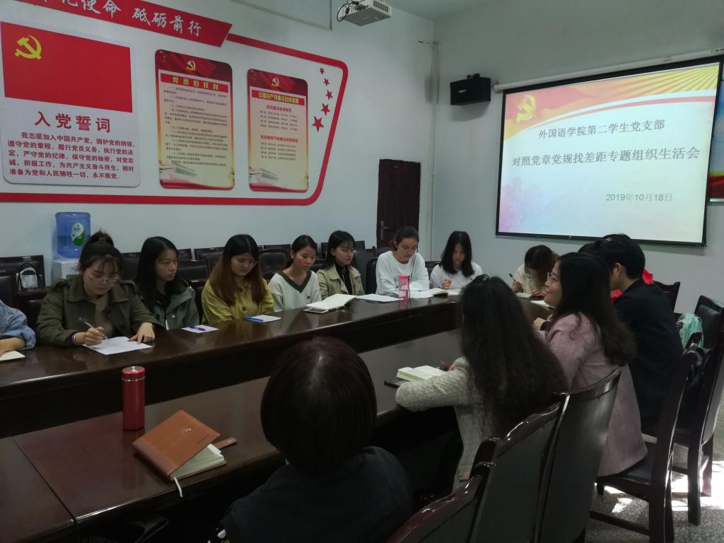 为深入学习习近平新时代中国特色社会主义思想,进一步扎实开展“不忘初心、牢记使命”主题教育,10月18日上午,外国语学院学生第二党支部在外国语学院会议室召开“对照党章党规找差距”专题组织生活会。外国语学院党总支组织员蒋泓洁,副书记温萍参加了此次会议。会议由支部书记魏春梅主持。