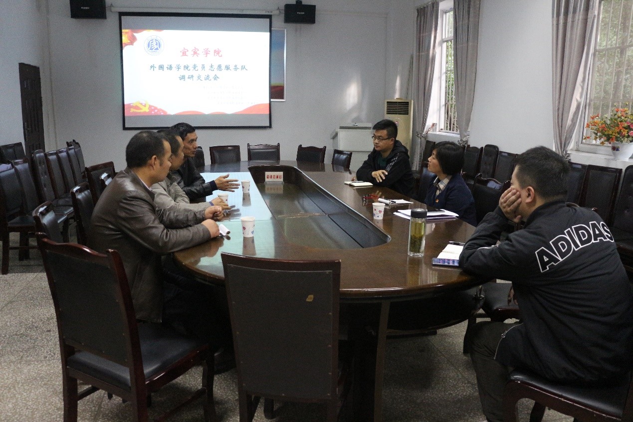2019年10月22日下午,外国语学院在铭志楼一楼会议室召开党员志愿服务队调研交流会。党总支书记罗春雁、党总支副书记温萍、团总支负责人袁超和宜宾市翠屏区金坪镇一步滩小学、宜宾市翠屏区思坡镇新龙校区和金城校区三个学校的负责老师参加了调研会。