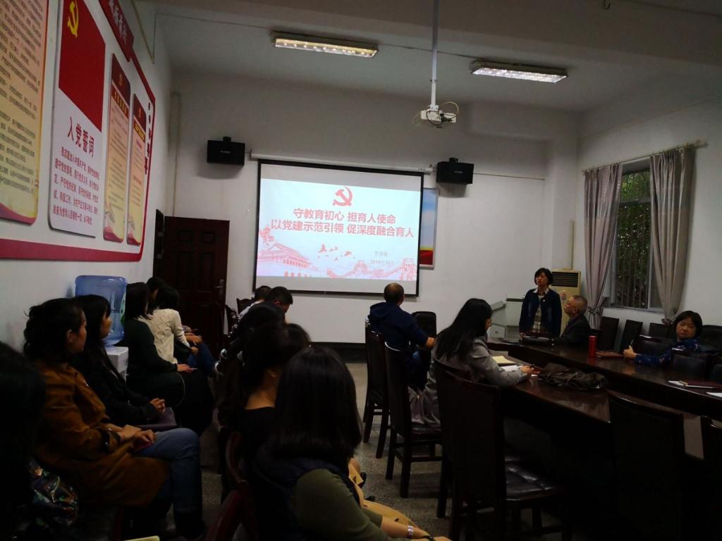 2019年10月23日下午,外国语学院党总支书记罗春雁在学院会议室为全体师生党员讲了 “不忘初心、牢记使命”主题教育专题党课。学校主题教育第二指导组副组长、校长办公室主任顾晓明到场指导。